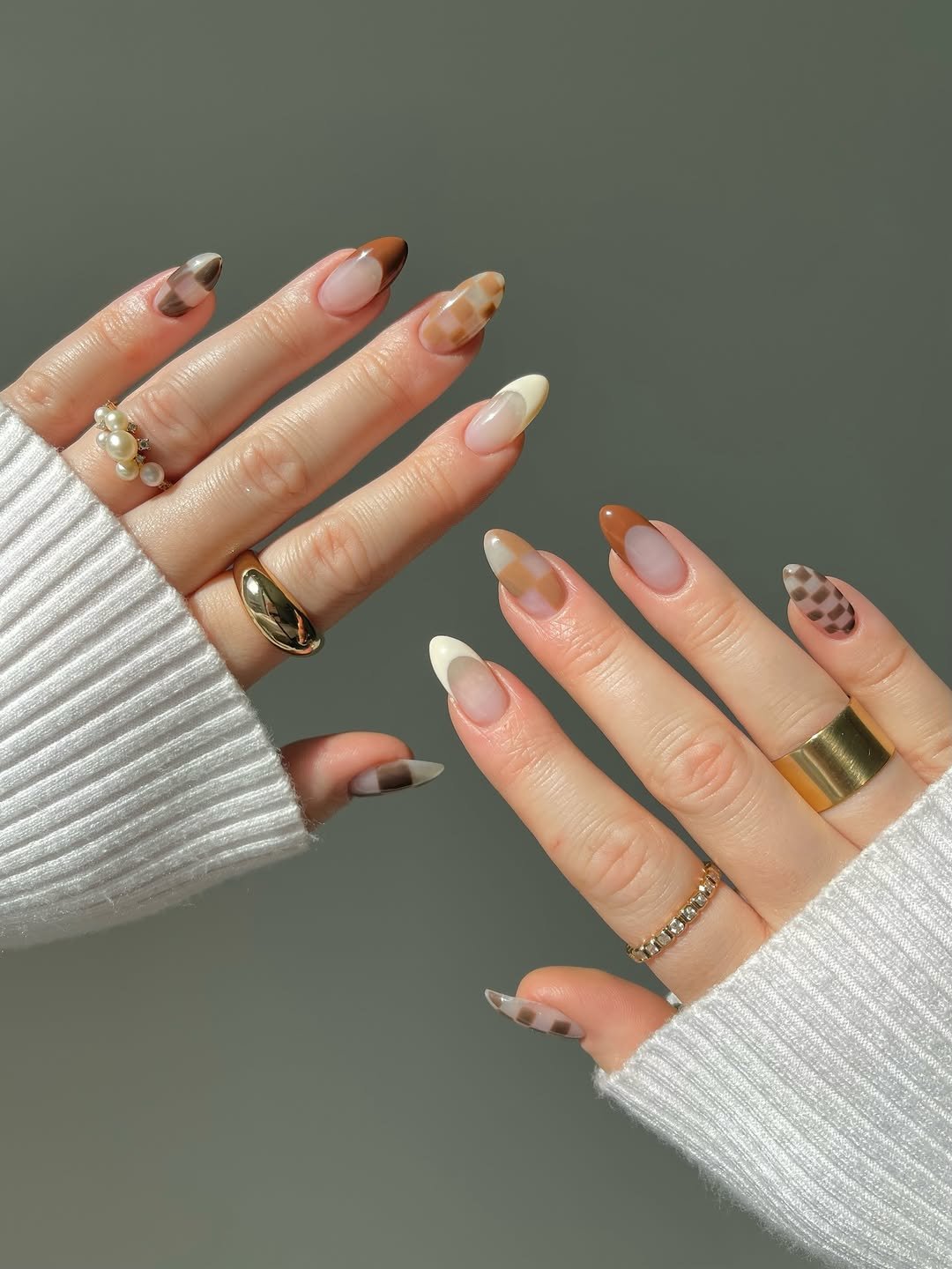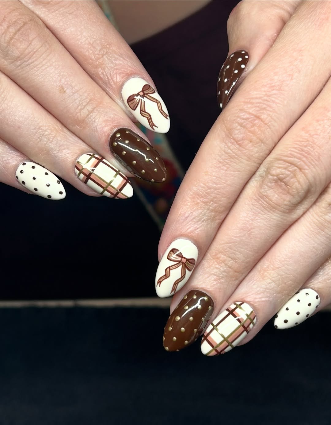 The layout keeps the eye moving. A couple full-color nails ground the design, while the accent nails lift it. The plaid’s thin white lines contrast beautifully against the rich brown, adding structure to the softness.