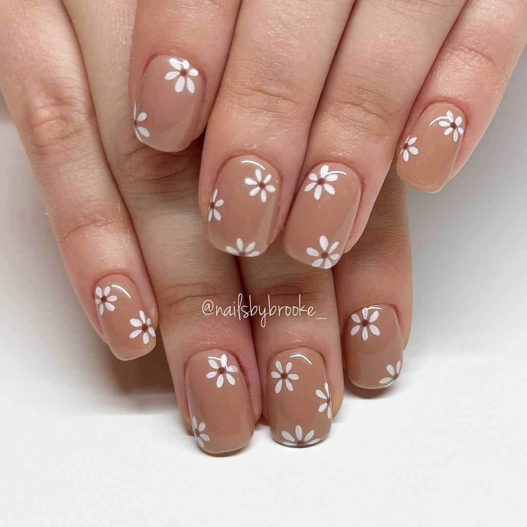 The flowers are crisp and evenly spaced, giving a sense of polish (pun intended) while staying fun and breezy. The short, rounded square shape is practical but still trendy, and the soft brown nude base keeps things grown-up.