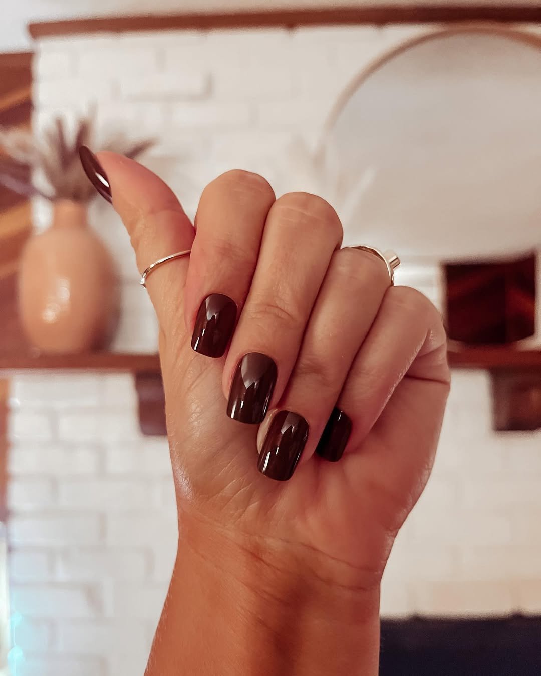 One word: smooth. This is that creamy chocolate brown that feels like it should come with a disclaimer—handle with care, too hot to touch. The polish is perfectly even, glassy, and unapologetically bold in its simplicity.