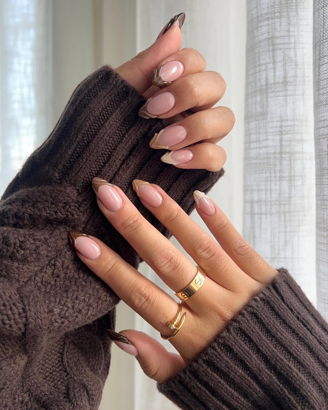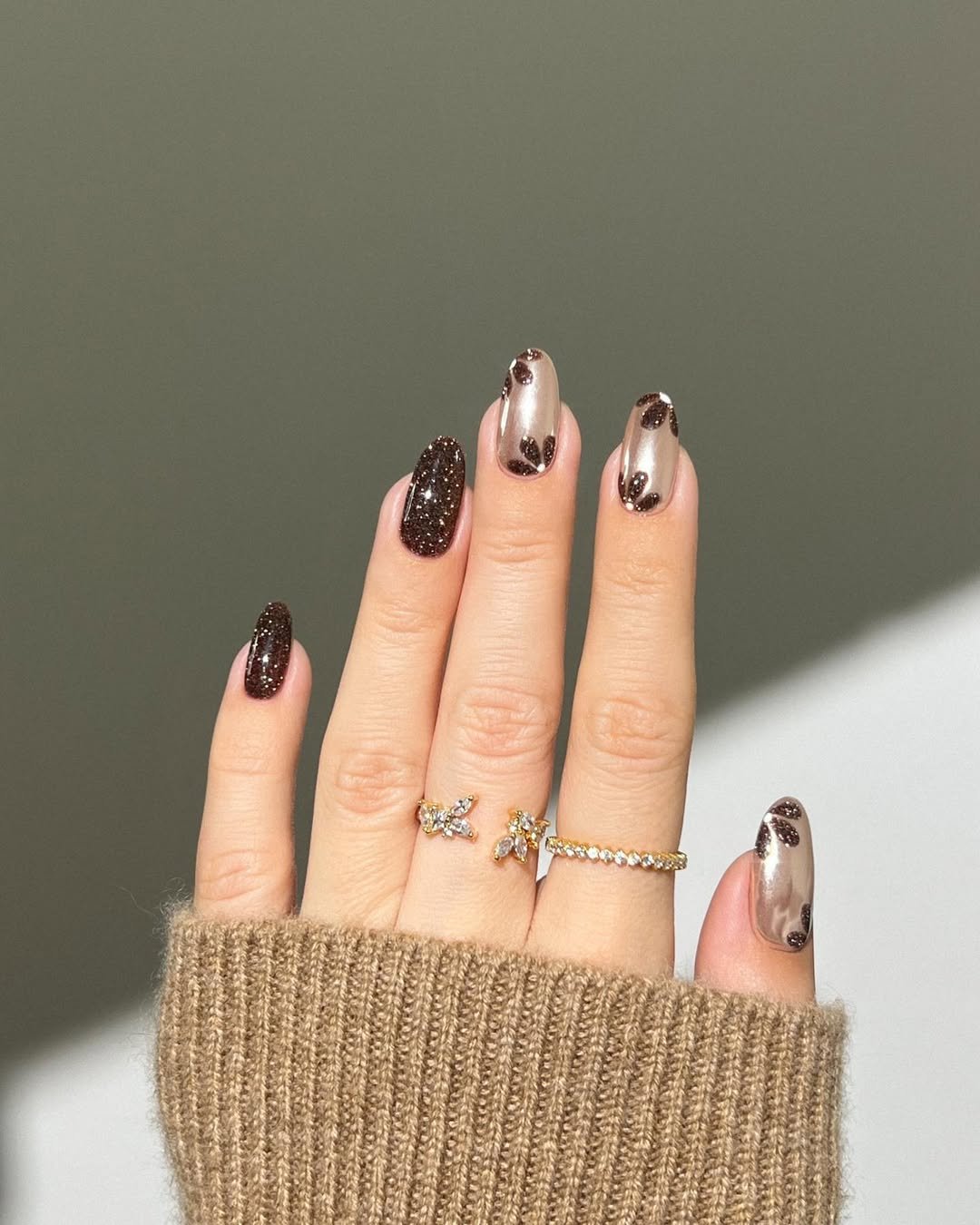 It’s the perfect example of how little touches—like metallic detailing and tone mixing—can elevate your entire nail game. Basically, if Audrey Hepburn wore brown polish, this would be it.
