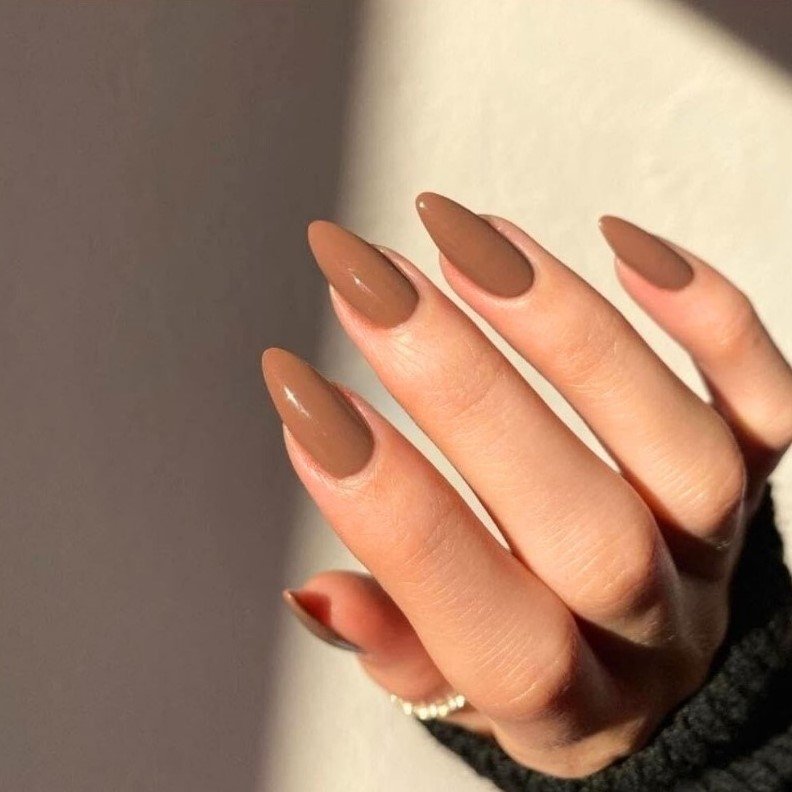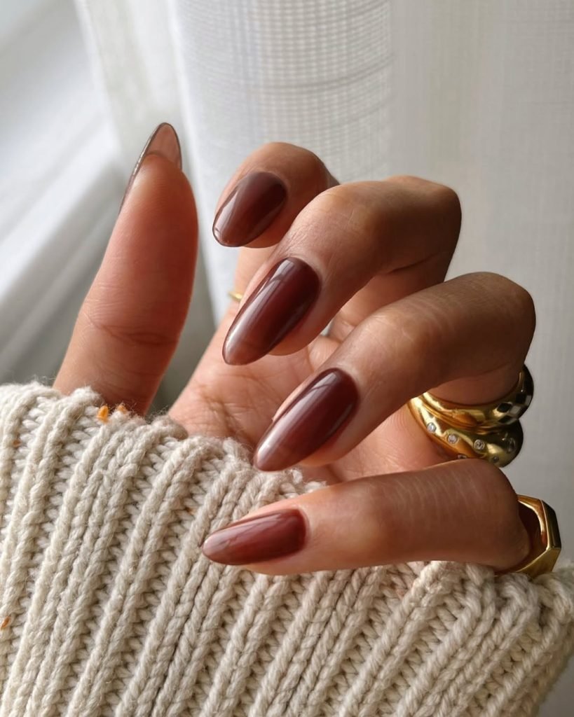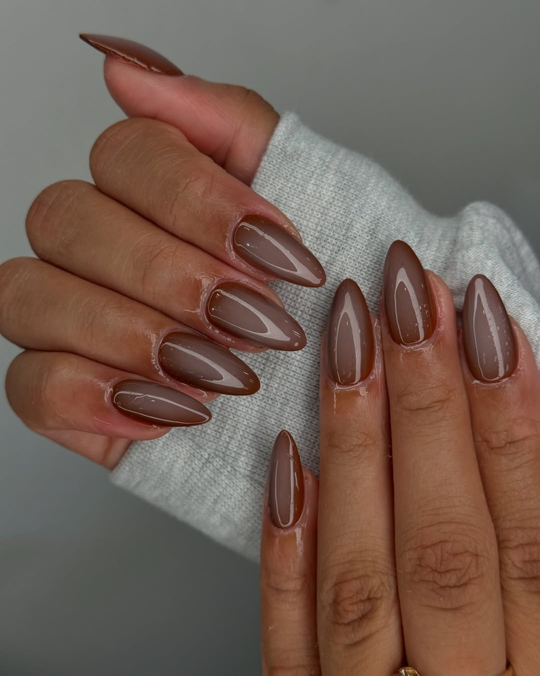 This one is for the chocolate lovers who like their polish silky, rich, and just a bit mysterious. @overglowedit went full-on glossy with this deep, almost edible brown that practically melts into the skin. There’s something about that shine against the soft almond shape that screams elevated minimalism.