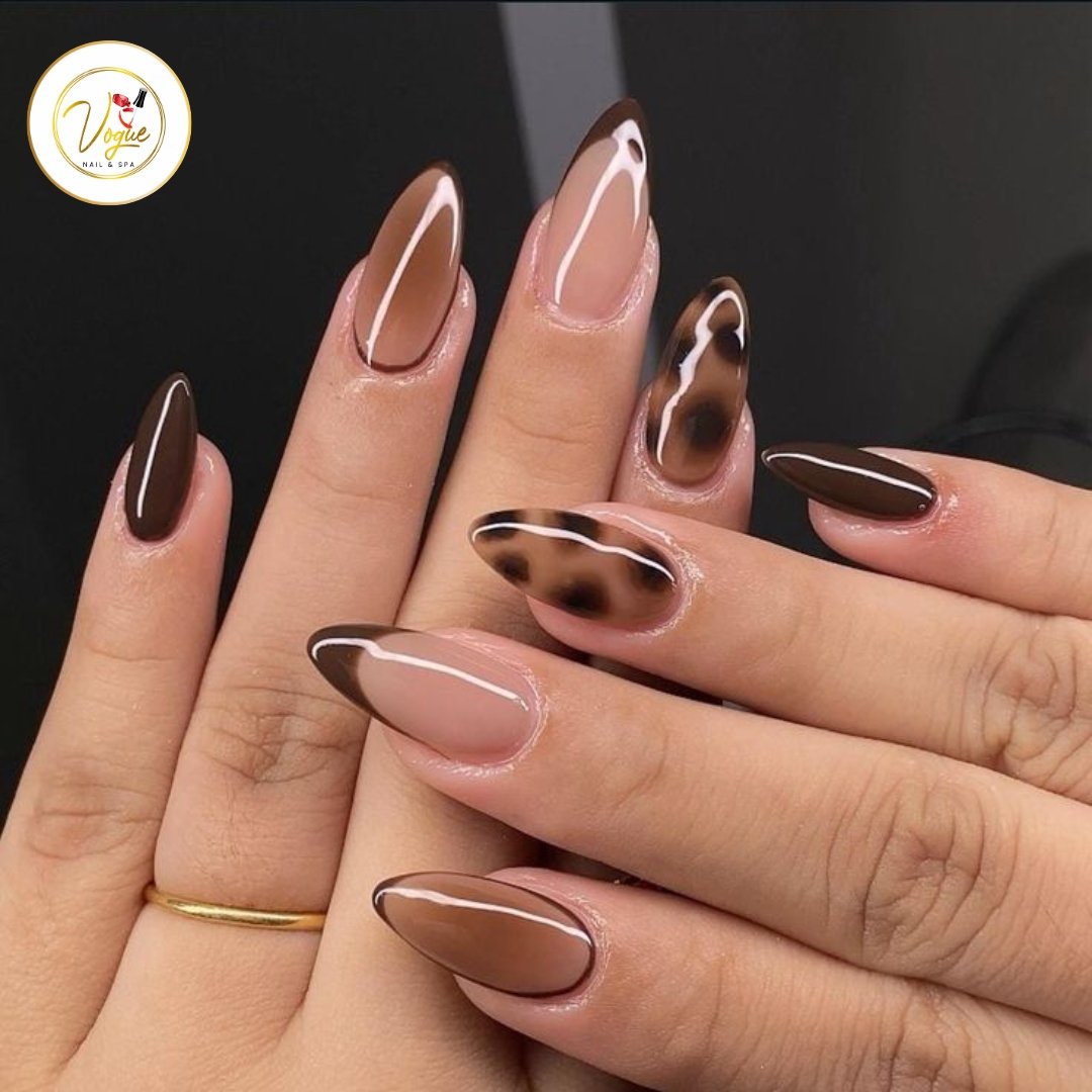 It’s all about that soft nude base that makes the darker browns pop. The shape is bold but balanced, making this an ideal mani if you want to feel instantly put together. It’s giving luxury, confidence, and “I book my own appointments, thanks.”