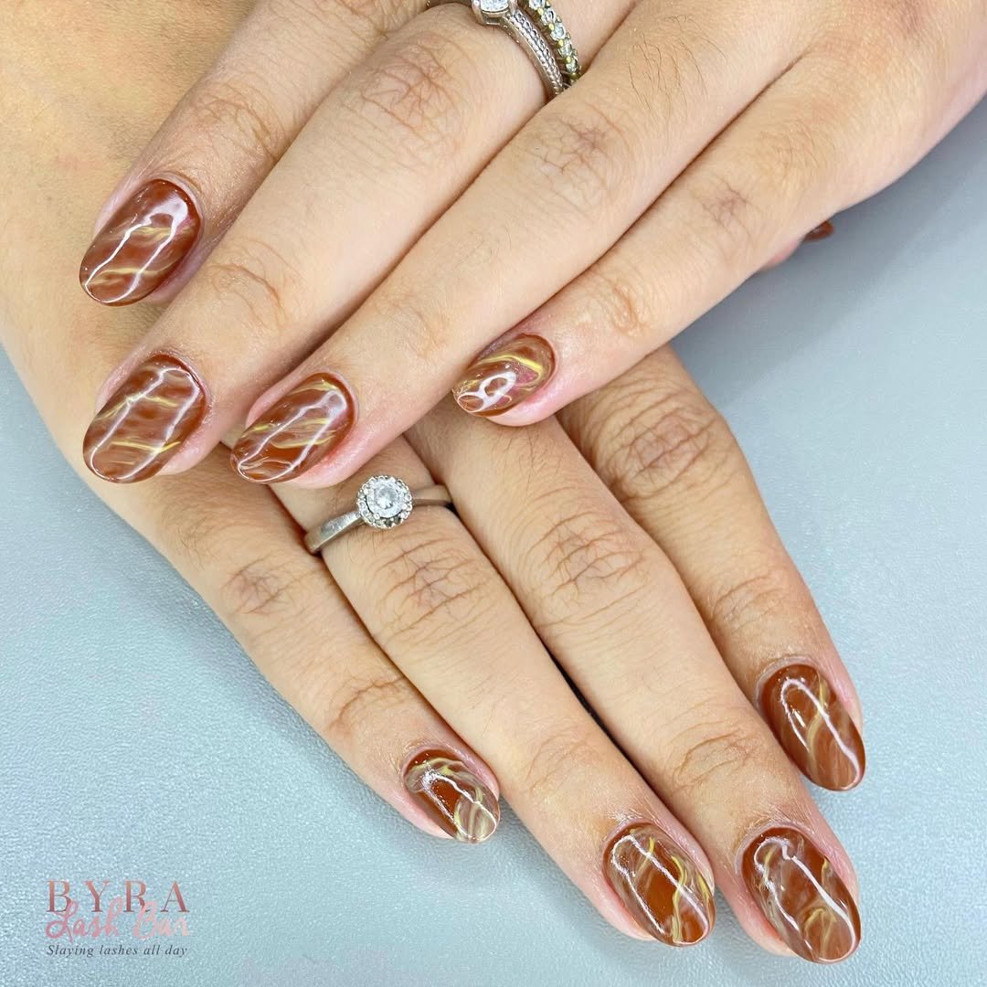 Short nails can absolutely turn heads when done right, and @byralashbar shows exactly how it’s done with this swirled caramel mocha moment. The marble design has a delicious, coffee-shop quality to it—like a perfectly poured latte with ribbons of foam and espresso mingling together in fluid harmony. There’s a soothing quality to the pattern that makes it feel soft and wearable, but still packed with detail and dimension.