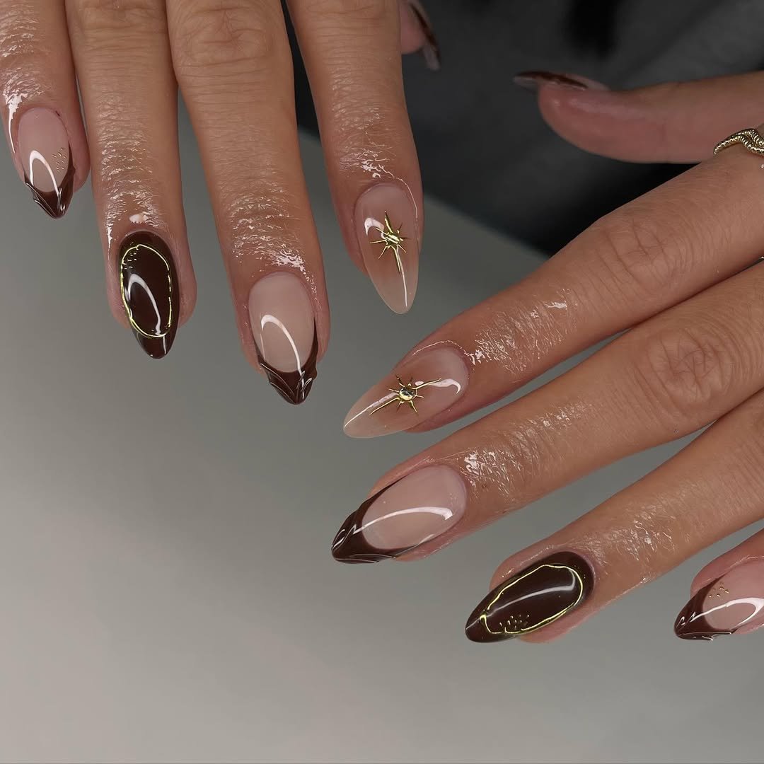Brown French tips, but make them fashion. @prettymuch_nails served up a modern twist on a classic by mixing chocolatey tips with nude bases, plus a couple gold-studded starbursts that take it up a notch. It’s glam, but low-key about it.