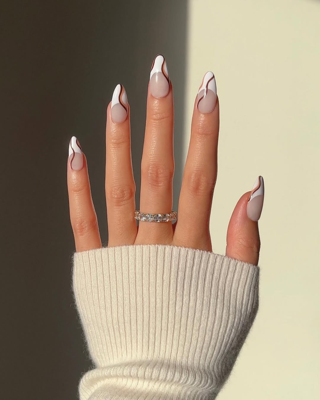 Every nail is a little different, which makes it feel custom and one-of-a-kind. There’s a rhythm to the asymmetry that just works. The white line detailing gives a crisp contrast, like a clean canvas kissed with warm browns.