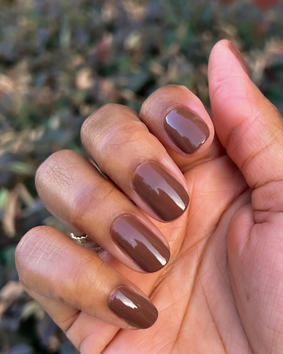Trinnie’s set is all about that glossy dimension. The polish almost looks like it’s still wet—in the best, freshest way possible. The brown isn’t too warm or too cool; it’s the perfect neutral to match a pumpkin-spice latte or a classic trench.