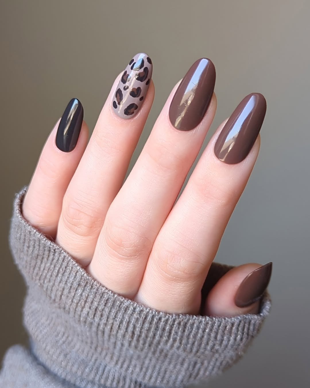@ilnp takes the neutral game to the next level with this mix of glossy brown polish and a single statement nail featuring leopard print. The tones here are rich and dark, with a smooth, high-gloss finish that makes every nail feel polished and intentional. That one leopard accent? Just enough to give the whole look a sense of play without going full-on wild.