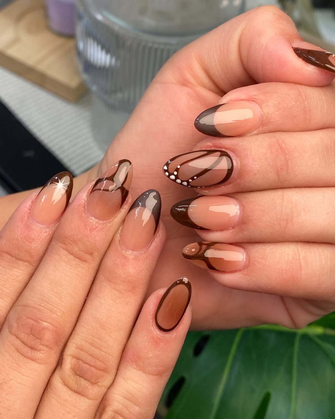 Mocha swirls, café au lait tips, and a few chocolatey outlines come together like a dessert tray for your fingertips. @nylove_nail absolutely nailed the cozy vibes with this mix of sheer browns, soft nudes, and artistic patterns that feel both retro and modern. That dot detail on the butterfly wing design? Chef’s kiss.