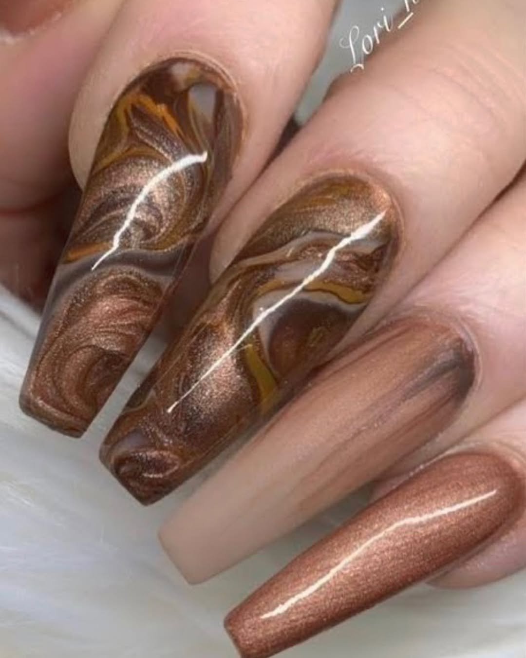 Now this is drama done right. The swirling metallics are molten and hypnotic, like stirred espresso and caramel under candlelight. You can’t quite look away—and why should you? Each nail is a little piece of art.