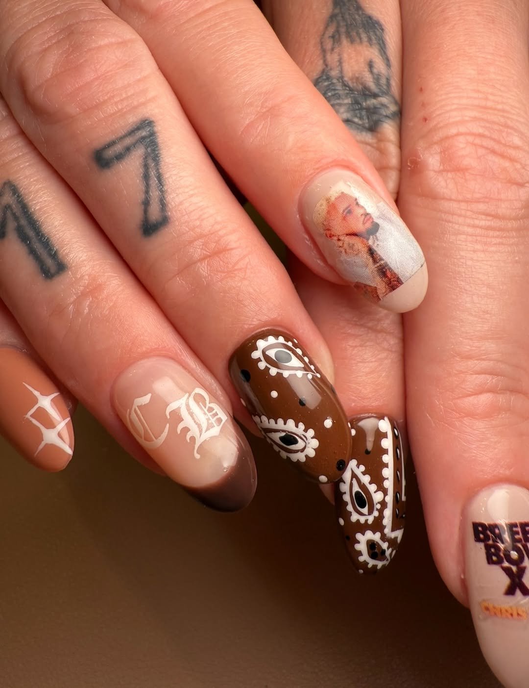 If your mood board is somewhere between Y2K nostalgia, Western flair, and modern street style, then @danis.manis just served your perfect set. There’s so much going on here—bandana patterns, gothic lettering, cowgirl motifs—and somehow it all feels cohesive. Each nail is its own little rebellion, painted in rich chocolate and espresso tones with white accents that pop in the coolest way possible. The boldness is real, but it never crosses into chaos.