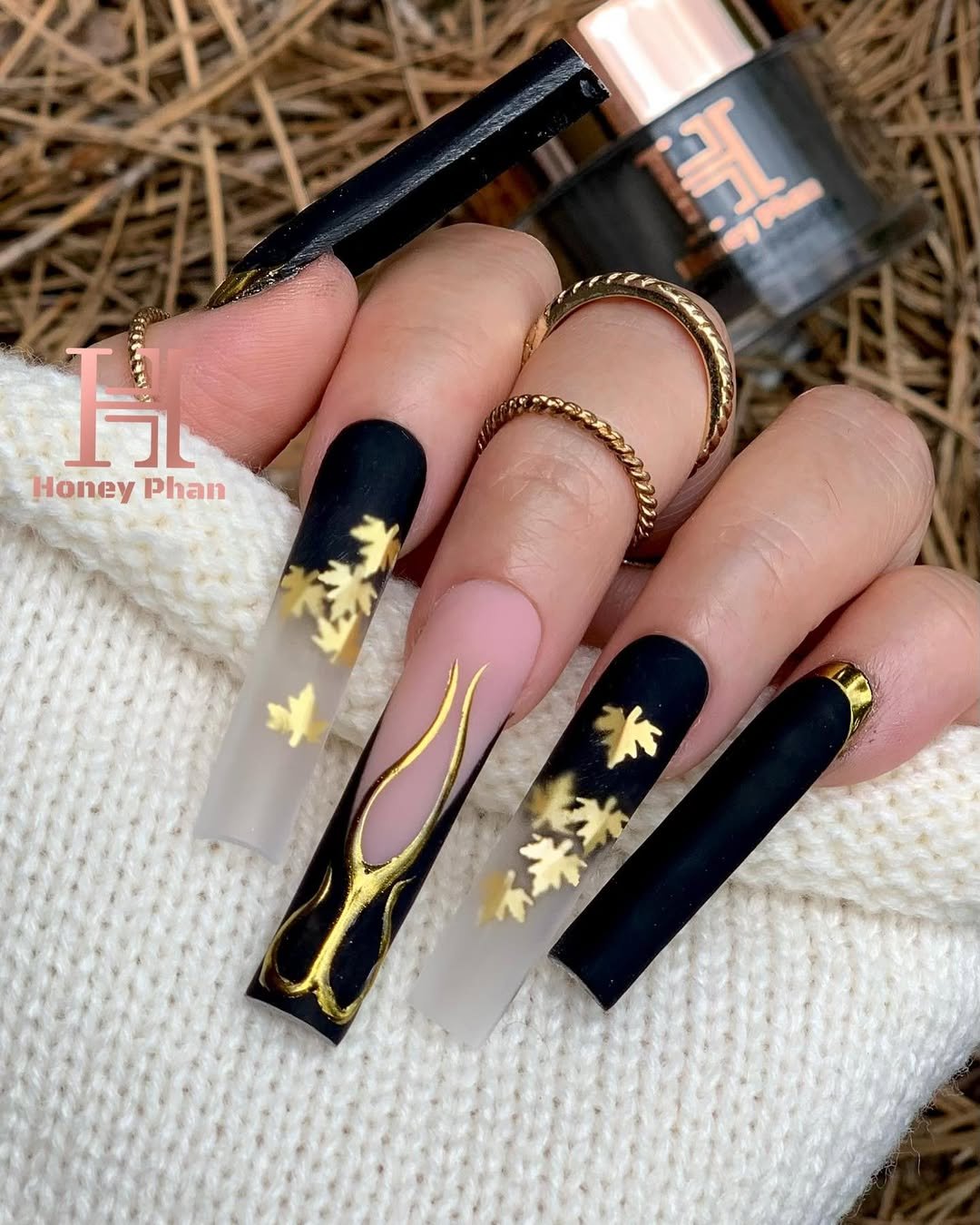 Ending strong with this ultra-glam set. Matte black mixed with translucent bases and metallic gold brush accents feels expensive in the best way. These nails walk into a room before you do.