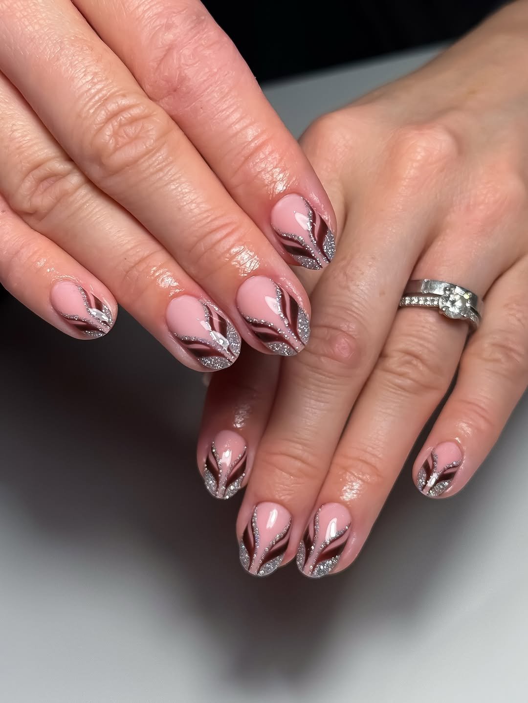 Soft pink bases with flowing brushed accents and glittery edges? Yes please. This set feels like modern bridal meets everyday luxury — delicate, glossy, and beautifully balanced.