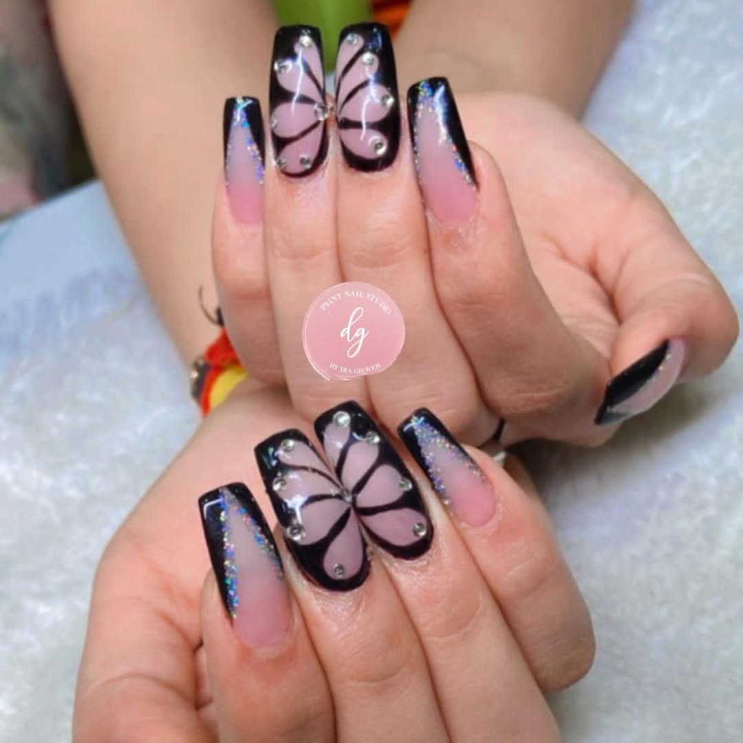 These are pure drama in the prettiest way. That soft pink brushed ombré fading into glossy black tips already feels luxe — but then you add the butterfly detailing and rhinestones? Instant main-event energy.