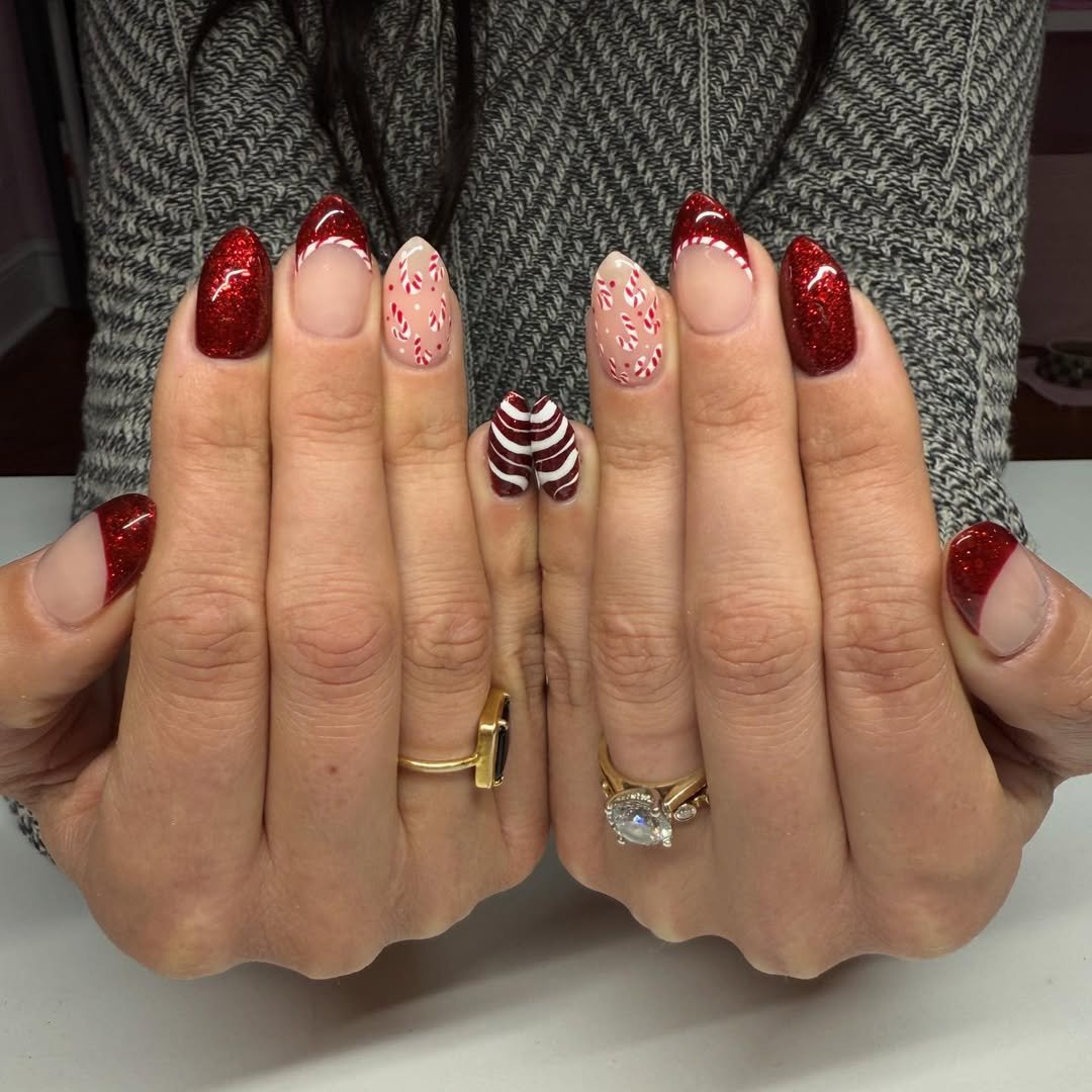 Playful, sweet, and full of personality — these brushed candy-inspired details are pure joy. The red shimmer tips mixed with soft nude bases make everything feel fun but still clean.