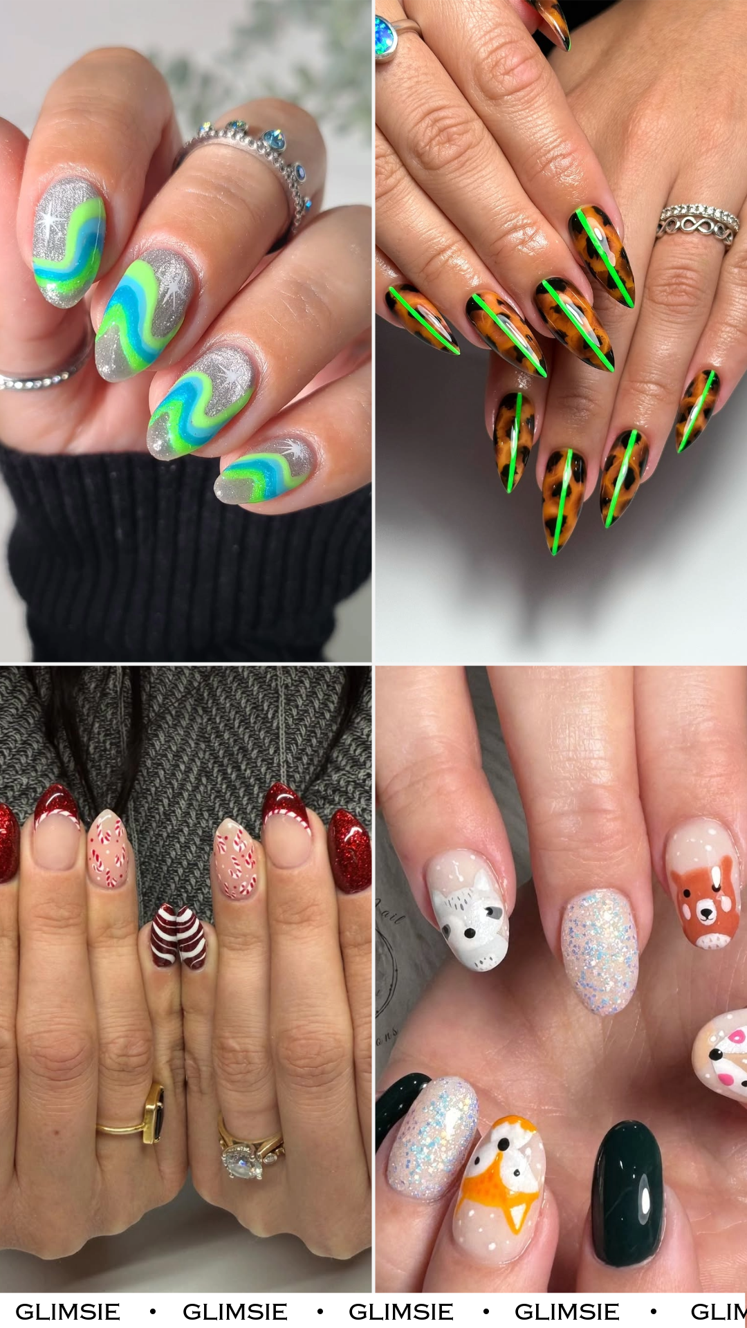 These feel like a warm hug in nail form. Tiny woodland faces mixed with soft glitter accents give major cozy-core vibes — playful, detailed, and surprisingly chic. It’s the kind of set that makes strangers lean in closer just to admire.