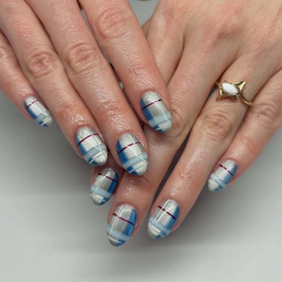 Brushed plaid? Yes, it’s a thing — and it works. These soft blues and silvers layered in clean strokes feel cozy-meets-modern, like your favorite winter scarf translated into nail form.