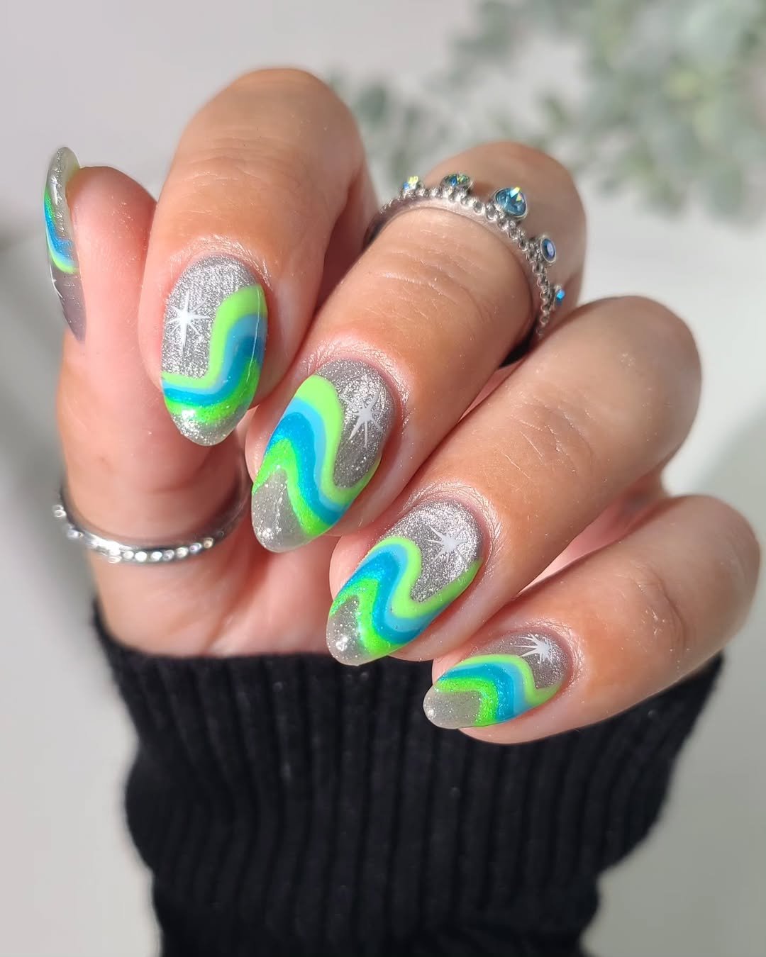 These nails feel like a futuristic mood board in motion. That metallic base paired with neon brush waves gives serious “main character walking into a club in slow motion” energy. It’s bold, glossy, and unapologetically fun — the kind of set that doesn’t wait to be noticed.