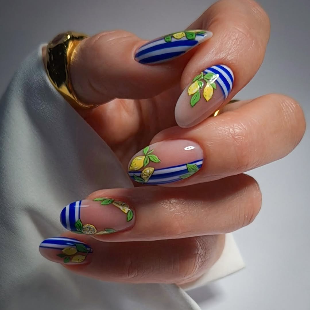 This set feels like a European summer on your fingertips. Crisp blue brushed stripes paired with tiny hand-painted lemons? It’s giving Amalfi Coast but make it manicure.