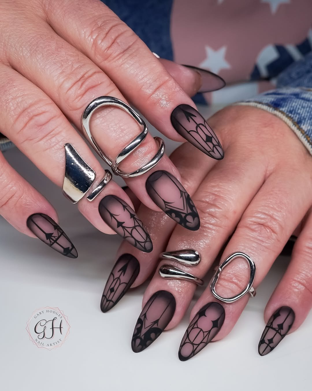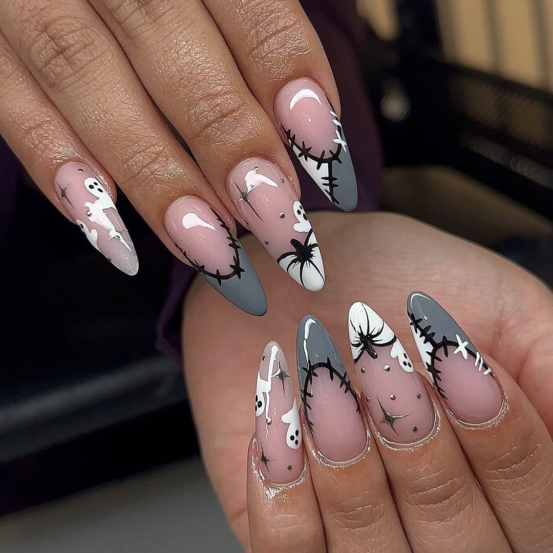 This set is spooky in the prettiest way. Muted blush bases paired with brushed gray tips and little ghosty accents feel mysterious but still wearable — like Halloween, but make it fashion.