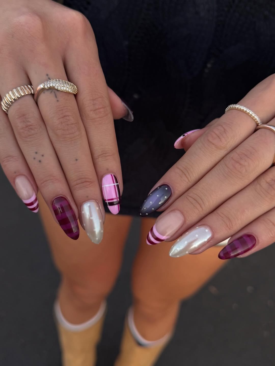 This set is all about contrast — stripes, dots, glossy neutrals, and brushed color blocks living together in perfect harmony. Every finger brings something new to the party.