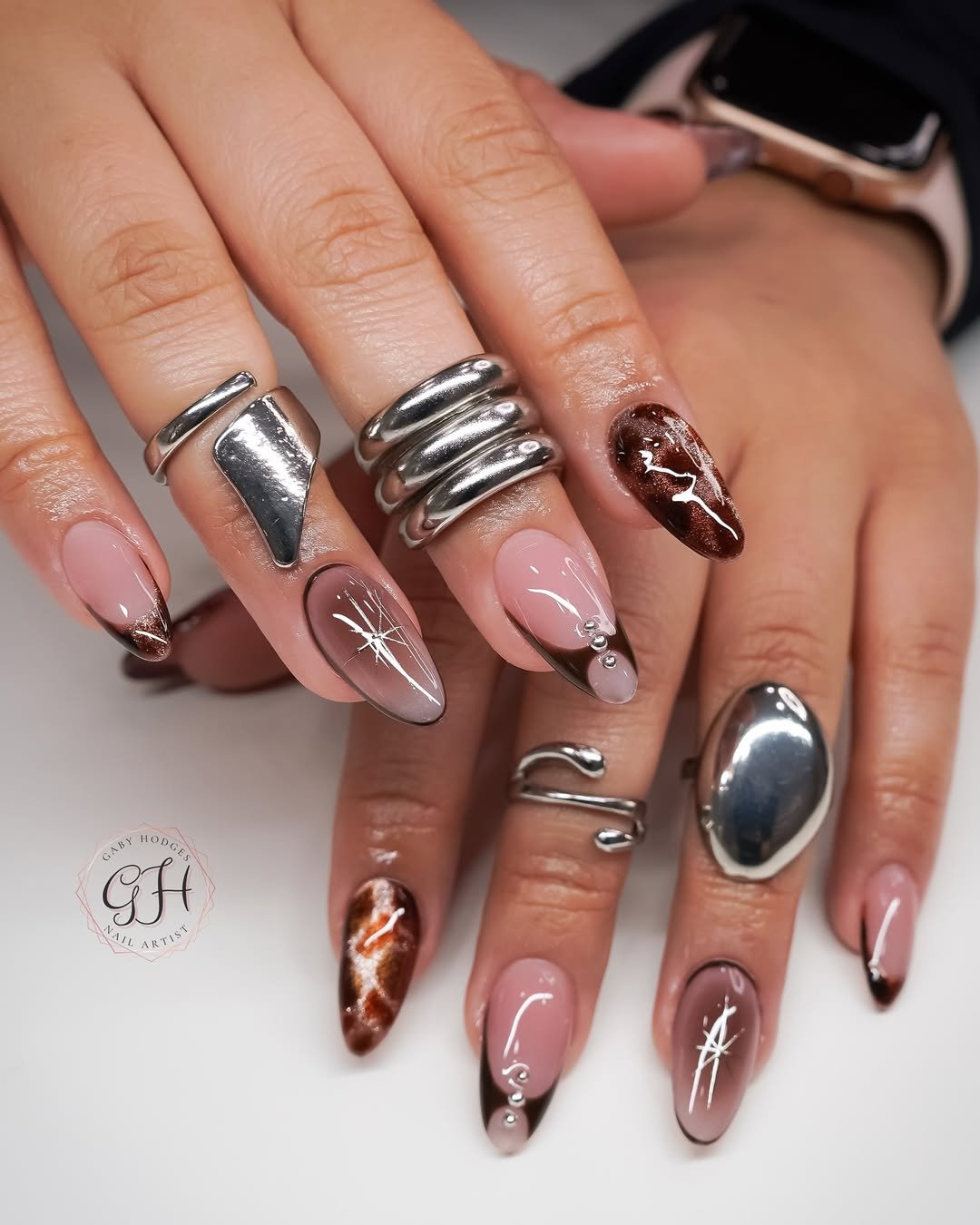 These brushed chocolate tones mixed with glossy nude bases are such a vibe. Warm, rich, and subtly sparkly — like your favorite latte but make it luxury.