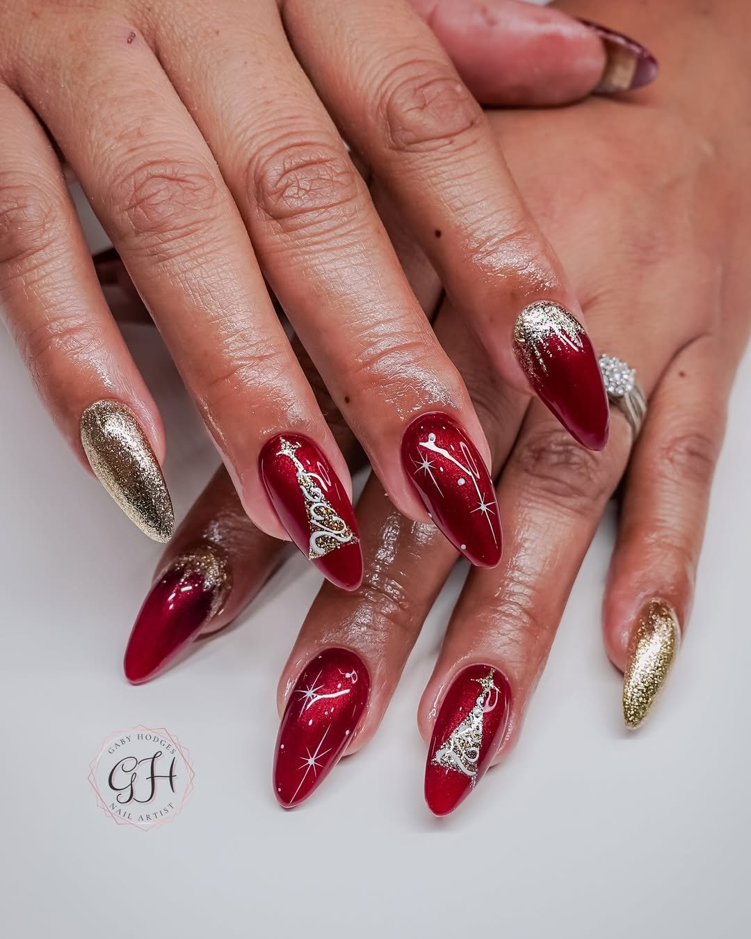 This one feels festive without screaming “seasonal.” Deep red brushed layers paired with gold accents give total holiday elegance — classy, cozy, and just the right amount of sparkle.