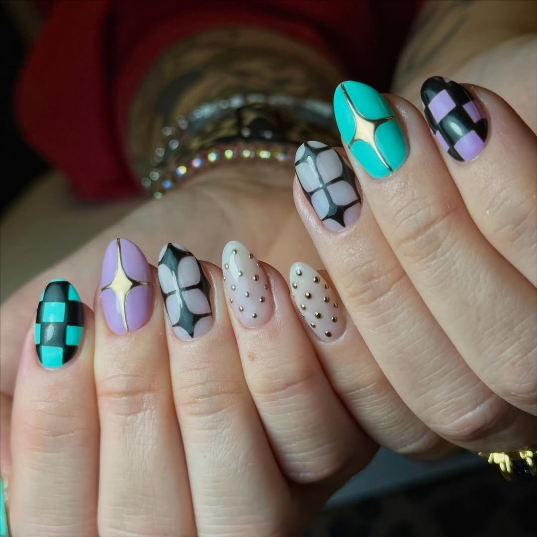 This set feels like abstract art walked straight into a nail salon. Bright shapes, clean lines, and brushed color blocking make every nail feel like its own tiny canvas.