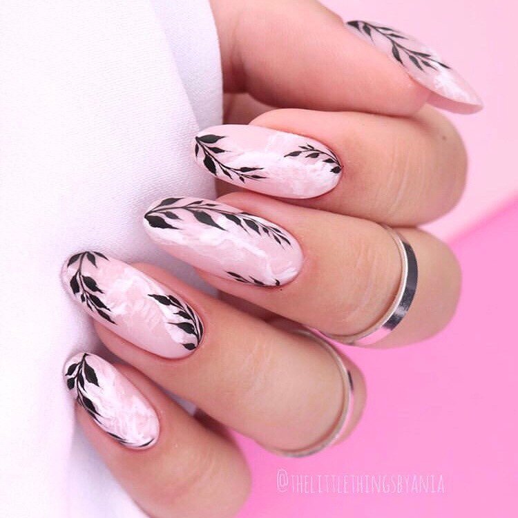 This one is dreamy. That soft pink brushed marble base layered with black leafy accents feels delicate but elevated. It’s romantic without being overly sweet.