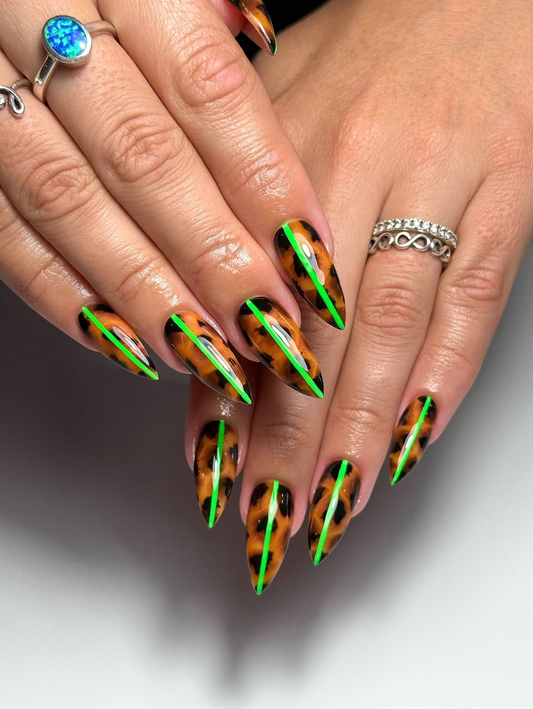 Classic tortoise just got a glow-up. Those sharp neon brush lines slicing through the warm browns add such a cool contrast — edgy but still classy. It’s one of those designs that instantly feels fashion-forward.