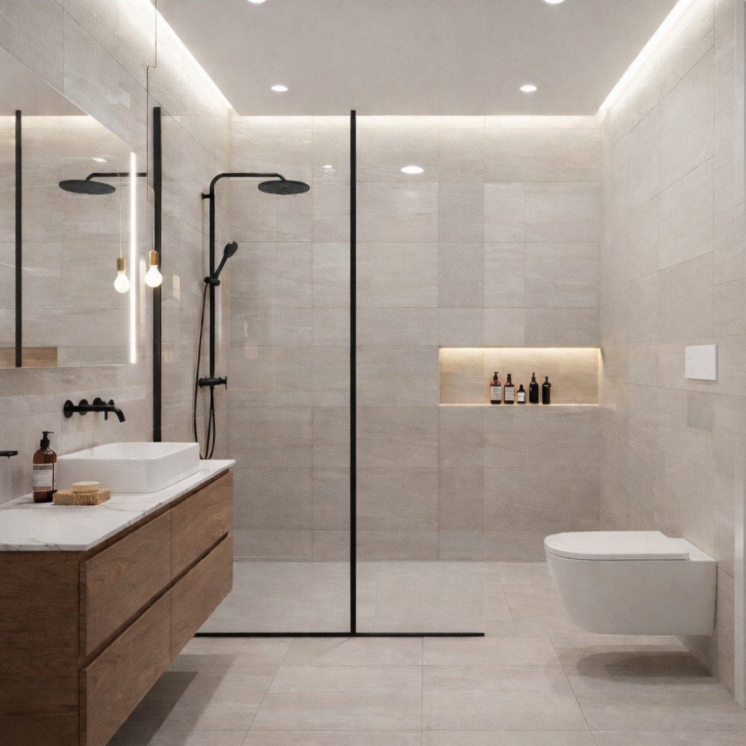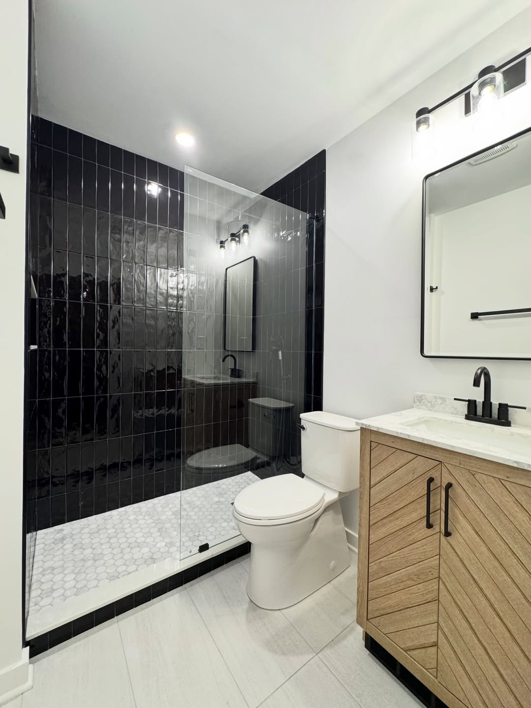 This one goes all in on contrast—and it pays off. Glossy black tiles turn the shower into a focal point, while the rest of the space stays light and balanced.