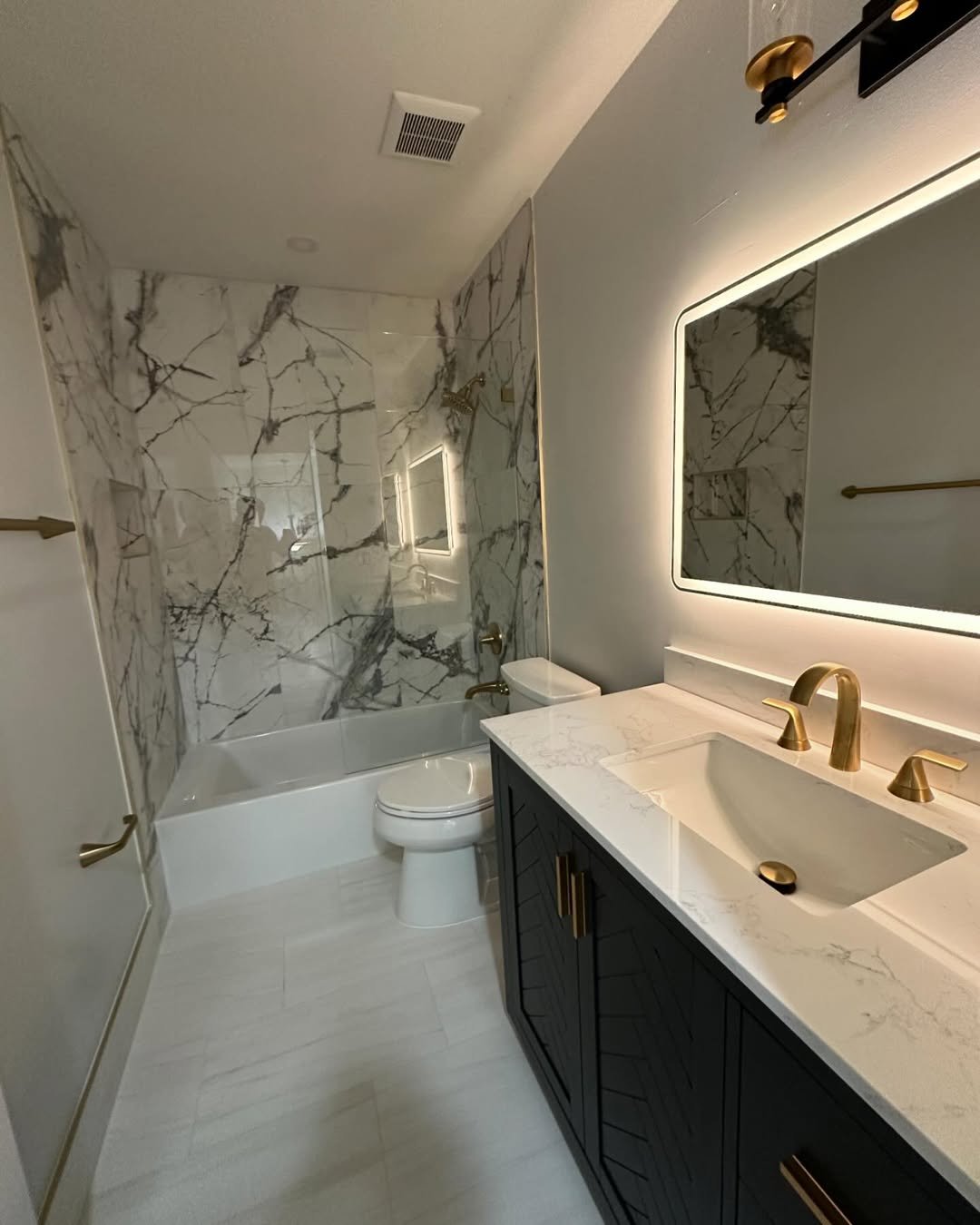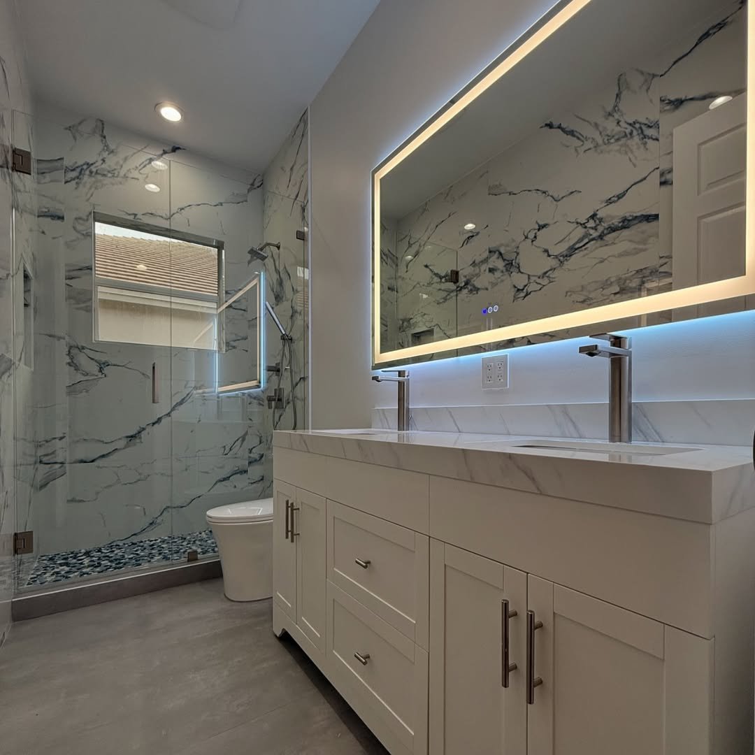 This bathroom leans into that high-end marble vibe, but it’s all about smart material choices. Large tiles, sleek fixtures, and that glowing mirror instantly elevate the space.