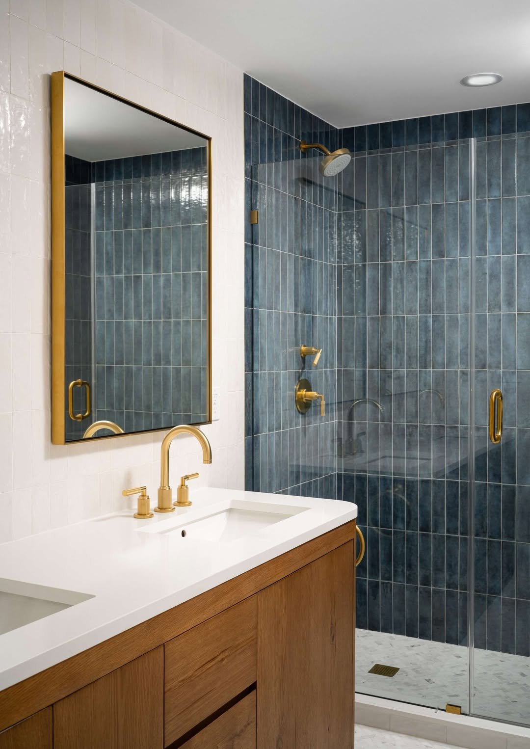 There’s something about navy tiles and brass fixtures that just works every time. It feels polished, a little elevated, but still totally approachable.