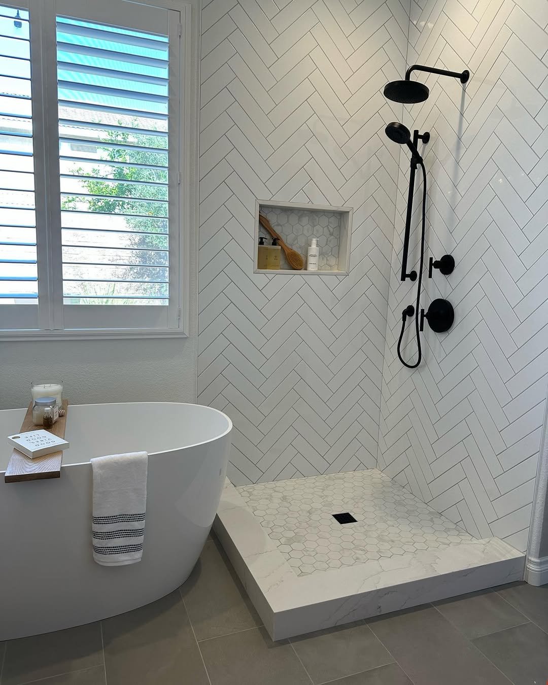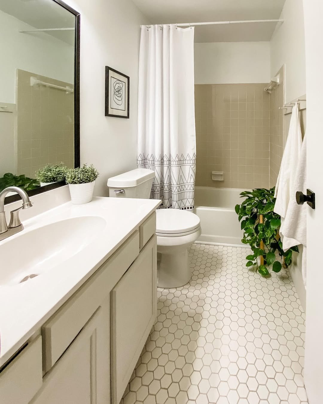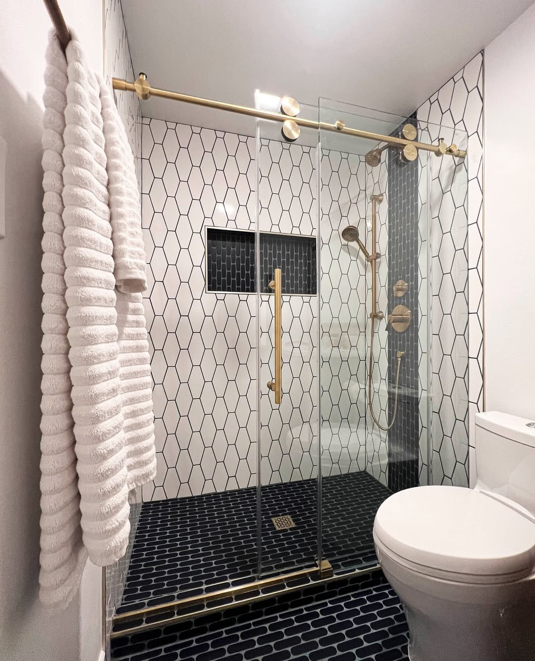 This one leans into contrast, and it works. Crisp white hex tiles meet dark accents for a look that feels sharp, clean, and a little bit playful.