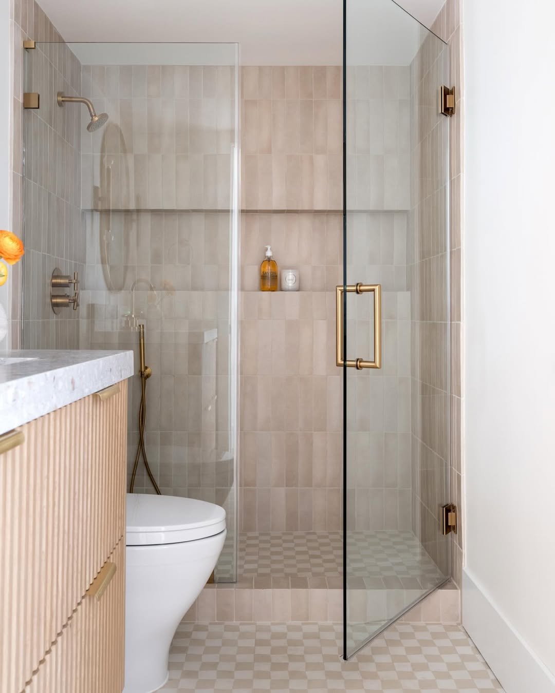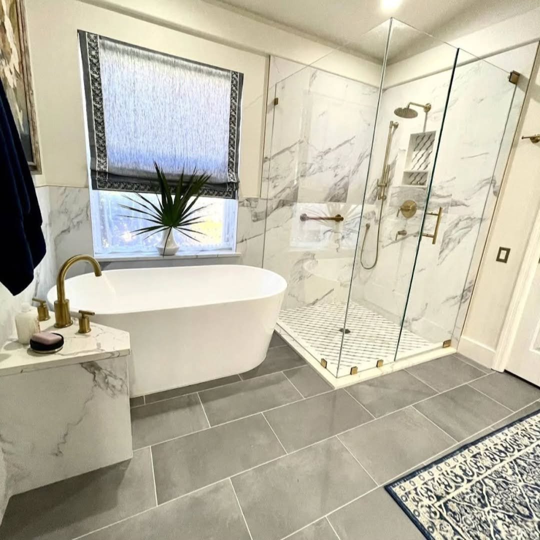 This one is proof you don’t need real marble to get that luxe look. Large-format tiles with soft veining instantly elevate the space, and keeping everything in a tight palette makes it feel way more expensive than it probably was.