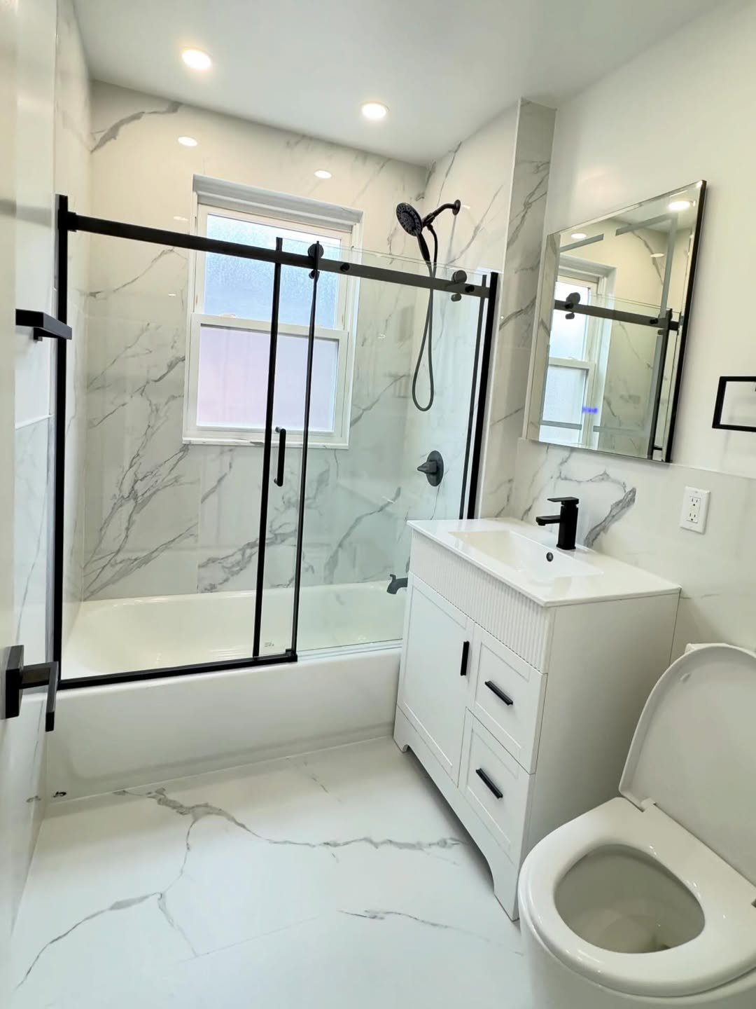 This bathroom keeps it sleek with marble-look surfaces that instantly elevate the space. Paired with black hardware, it feels modern but still timeless.