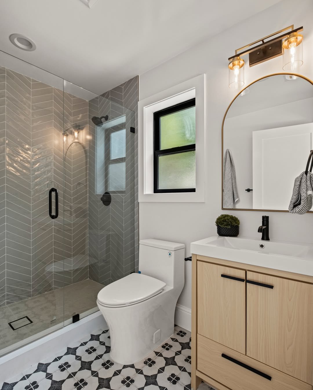 This bathroom keeps the walls simple and lets the floor steal the show. That patterned tile adds personality without overwhelming the space.