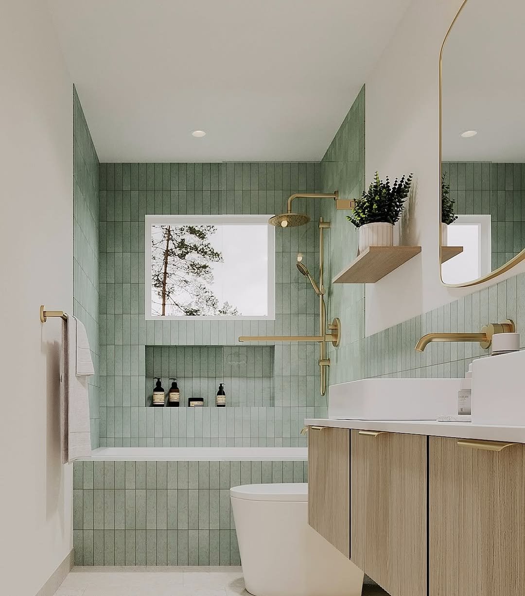 This space feels like a breath of fresh air. The soft sage tiles, paired with warm wood and brushed brass, hit that perfect balance between modern and calming—like a spa you’d actually want to use every day.