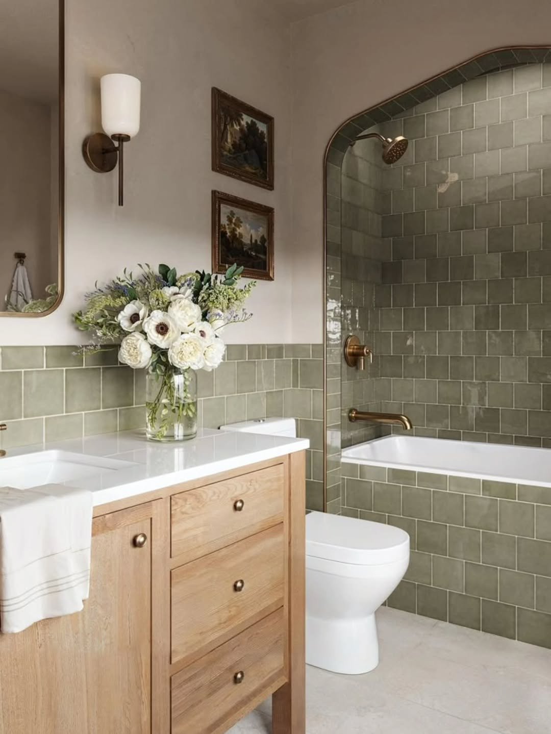 There’s something instantly calming about this muted green tile—it feels classic without trying too hard. Paired with warm wood cabinetry and those vintage-style fixtures, the whole space leans into that “collected over time” look.