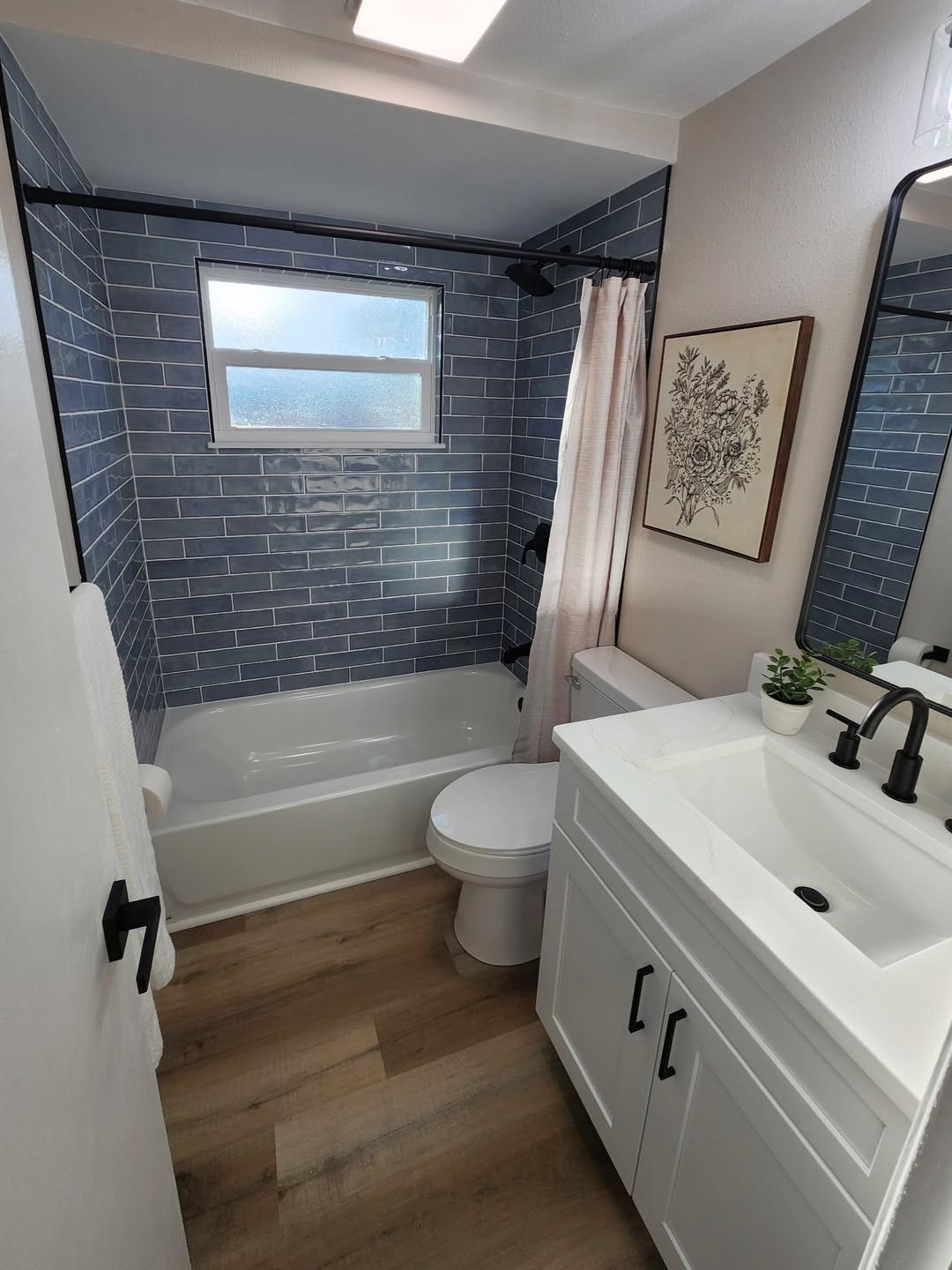 If you’ve ever doubted the power of tile—this is your answer. Deep blue subway tiles completely transform the vibe, turning a basic tub-shower combo into something that actually feels styled.