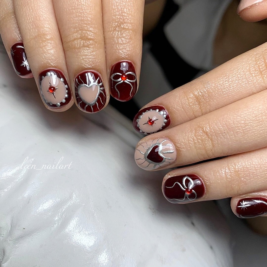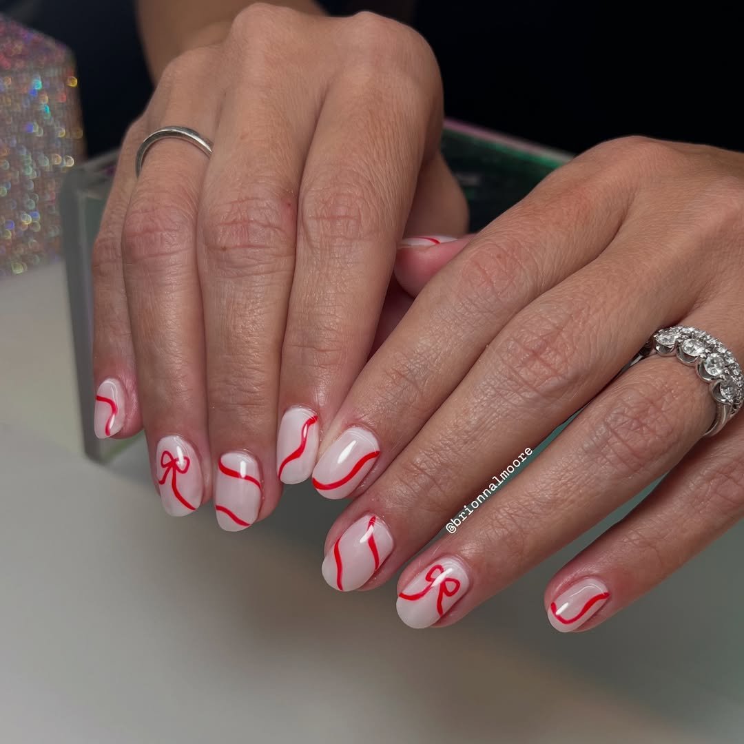This set proves you don’t need loud colors to make a statement. The sheer base with delicate red lines feels playful but still polished—almost like tiny bows dancing across your nails.