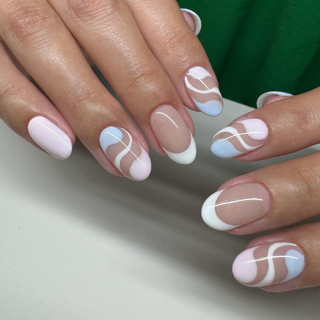 These creamy nude-and-pastel swirls are the definition of calm beauty. The rounded almond shape keeps things practical, while the fluid lines add just enough movement to feel intentional (not overdone). It’s soft, wearable, and very “I still want cute nails without committing to chaos.”