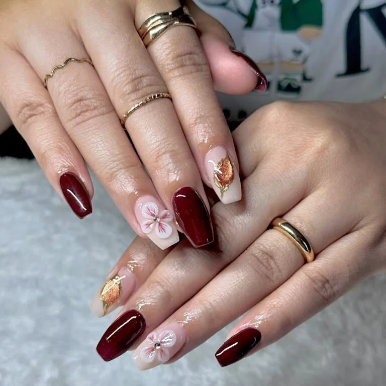 Here’s a sculpted floral fantasy in burgundy and gold. The 3D petals feel soft and delicate, and they sit beautifully against the clean blush base. It’s giving “bridal bouquet but make it nails.”