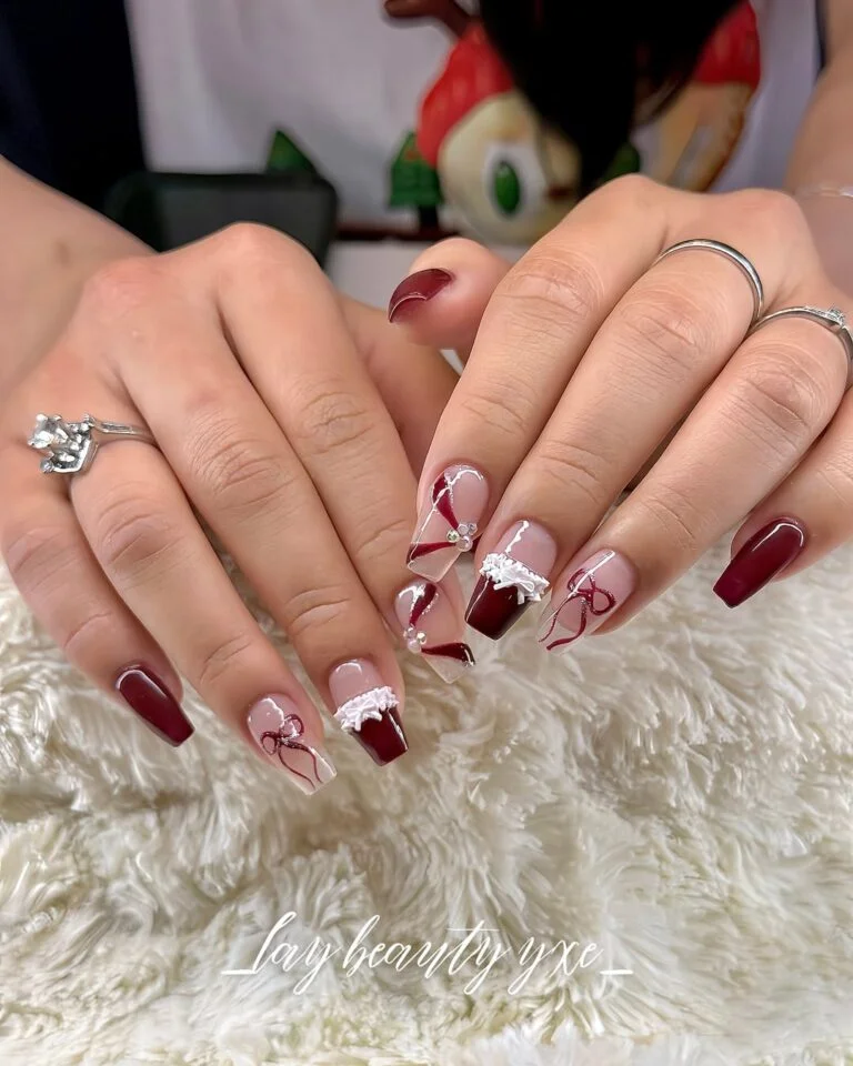 This one is pure romance. The lace details, the mini bows, and the deep red tips work together like they were always meant to be on a wedding mood board. It’s decorative but in the sweetest way—like little accessories for your nails.