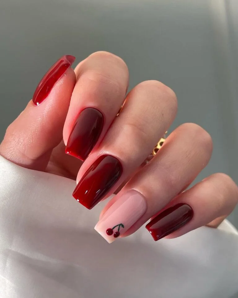 This set brings a playful sweetness to traditional wedding burgundy. The tiny cherries and little loops are cute without looking childish, and the deep red tips keep the whole look polished.