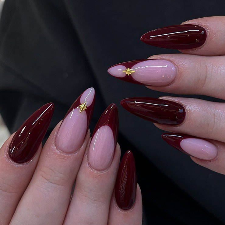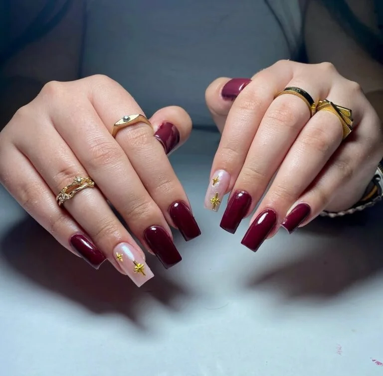 Rich, glossy burgundy paired with soft nude and star-studded accents? This set feels like a starry-night wedding wrapped into a manicure. The square shape adds confidence, while the gold stars add magic.