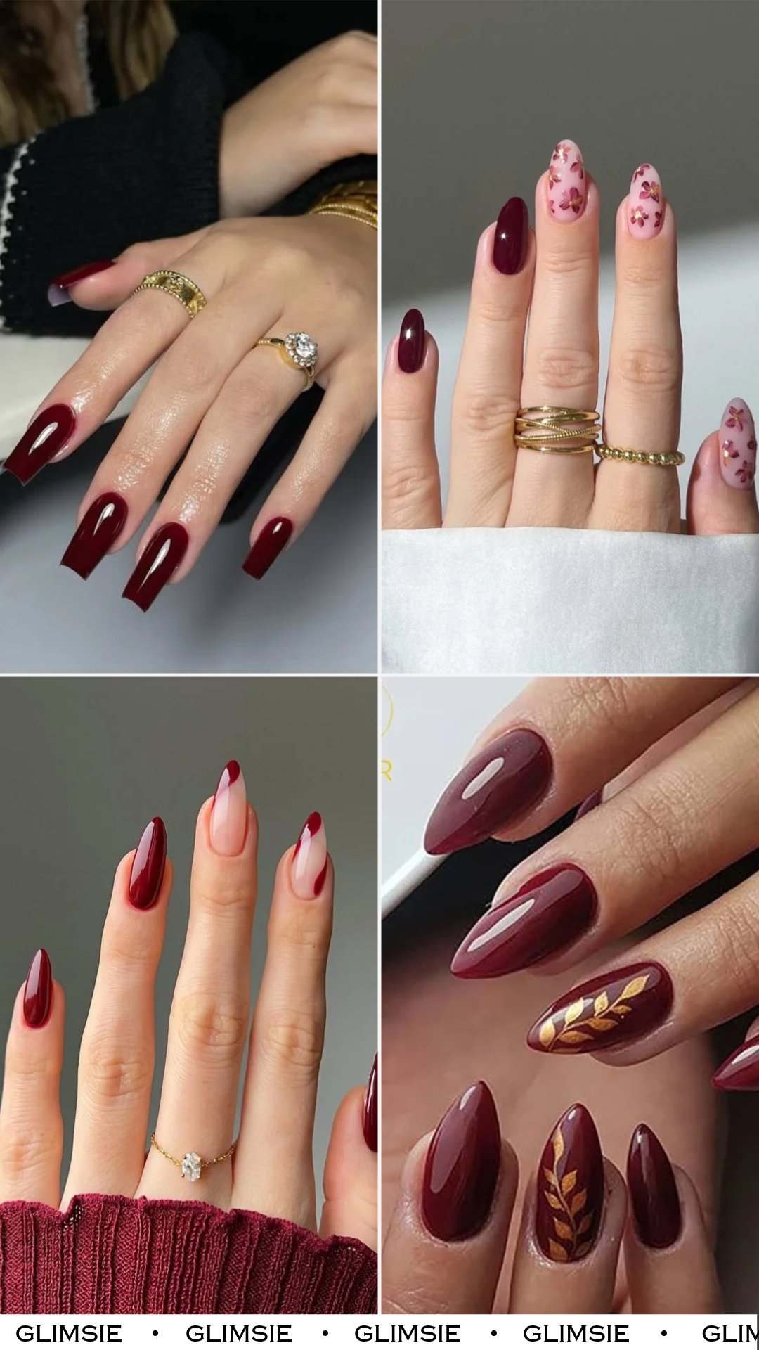 A mix of pure glossy burgundy with romantic, blurred florals—this set feels dreamy and painterly. That touch of gold in the center pulls everything together like jewelry on the nail.