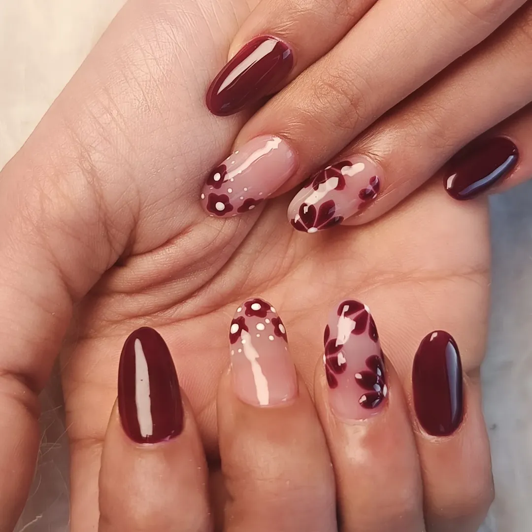 Floral energy meets rich wine tones here, and the combo is just… chef’s kiss. The scattered petals across the nude base feel delicate, while the full burgundy nails anchor the whole look in that deep, moody elegance brides love.