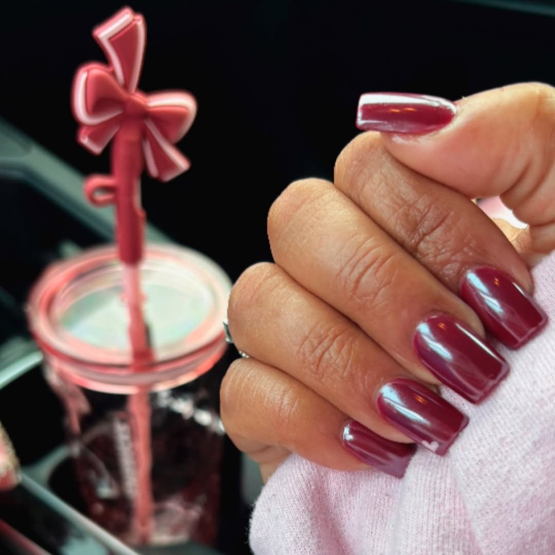 If you’re the bride who loves clean lines, sharp precision, and zero fuss, this ultra-glossy burgundy set is your soulmate. The length adds drama, but the smooth finish keeps everything classy and timeless.