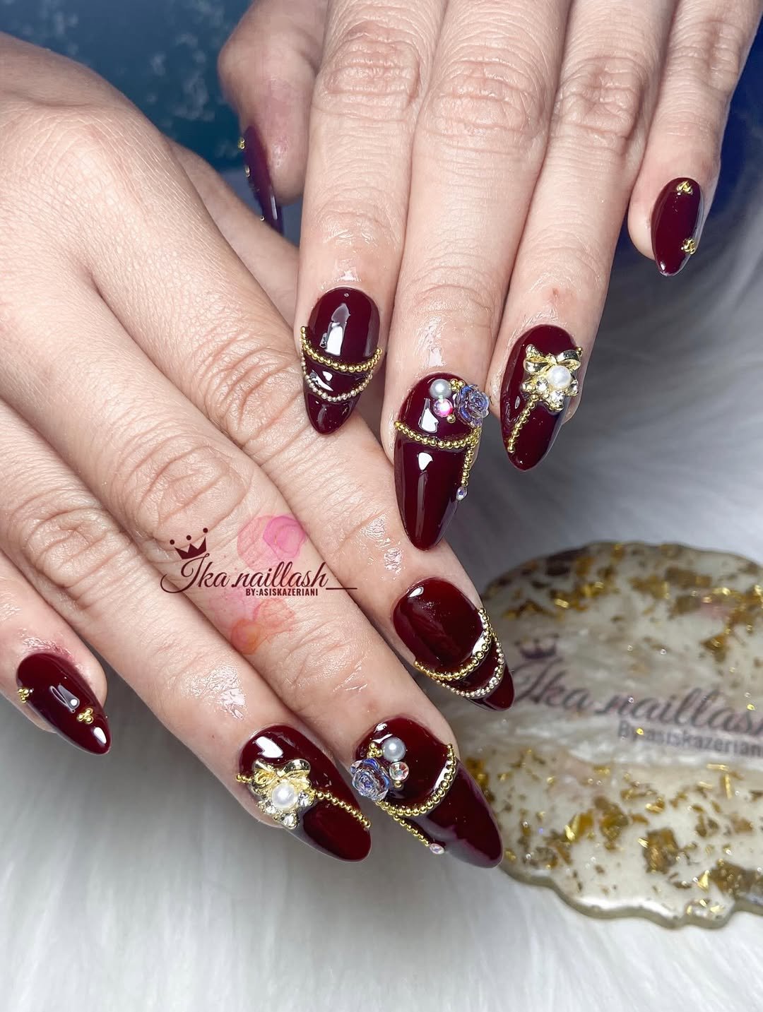 This one is bold simplicity done right. The glossy berry shade sits beautifully on its own, and that single gold leaf accent adds just enough richness to tie the entire look together.