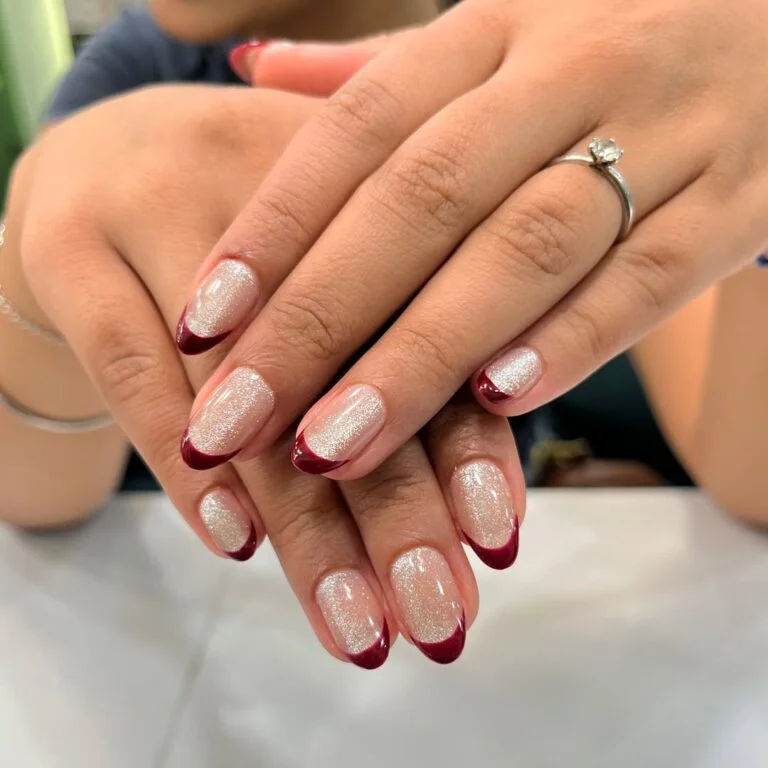 These dainty burgundy tips feel like the perfect “something elegant” for a wedding moment. The soft almond shape and sheer pink base keep everything light, while the deep red tips add just the right amount of drama. It’s giving romantic, but I’m not trying too hard about it.